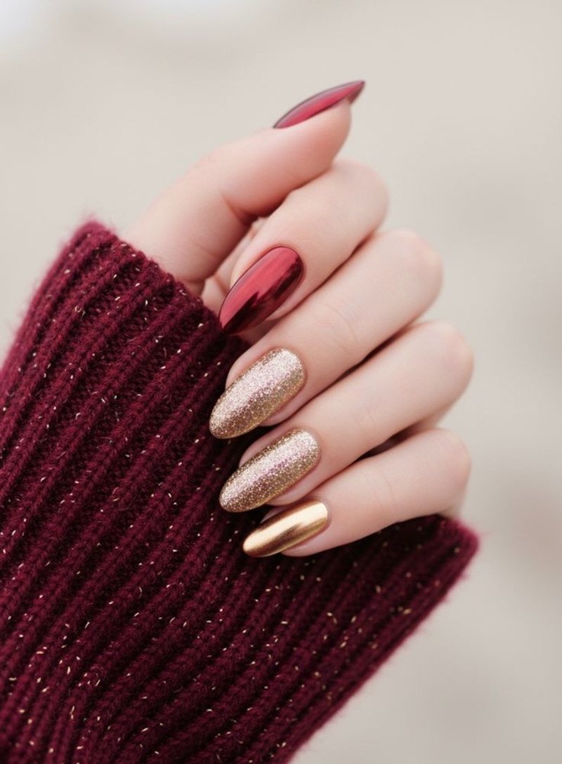 「金紅跳色」絕對是新年最經典、最不容易出錯的美甲配色組合。紅色象徵喜氣、祝福,金色則代表財富與好運,兩種色彩在不同手指之間交錯呈現,能夠有效打破單一色調的單調感;如果比例拿捏得宜(像是:2 紅 3 金、3 紅 2 金),整體風格還會顯得更加和諧、穩定,不會過於張揚。這樣的搭配不僅符合傳統的開運寓意,還可以藉由冷暖色調的對比,襯托出更明亮、更乾淨的手部膚色,是兼具年節氛圍與時尚感的美甲選擇。