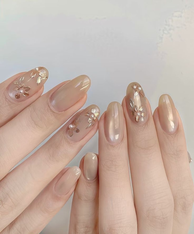 這款金色小花美甲不刻意追求高飽和、高閃耀的金屬感,而是以透膚裸色作為基底,襯托出帶有絲緞光澤的淺金色立體小花。色調介於香檳金與玫瑰金之間,既溫潤又柔和,不僅不顯俗氣,還特別襯亞洲人偏黃的膚色。細緻的花瓣線條、小珍珠點綴則為美甲增添了層次與精緻度,散發出清爽又帶有仙氣的氛圍;即使在春節過後延續到日常生活,也依舊自然、耐看,非常適合想要展現優雅、知性品味的女孩們。
