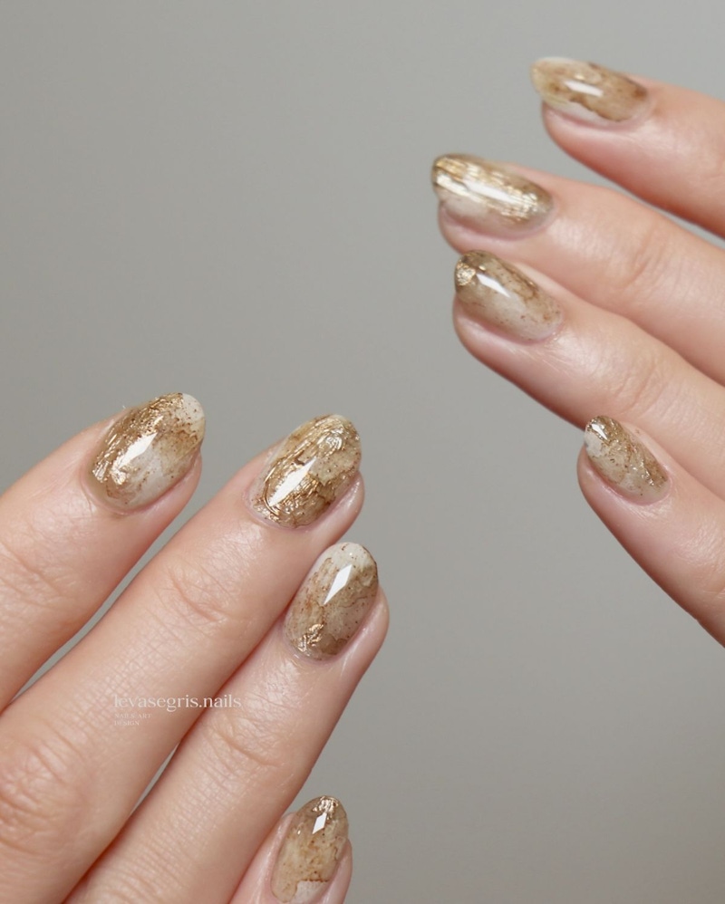 金色暈染美甲展現的是一種色彩流動的美感,透過金色與乳白色、裸色的不規則交織,營造出類似於大理石紋路或是星雲一般的朦朧層次。這樣的暈染效果柔化了金色銳利的存在感,使色彩邊界變得自然、富有深度;指彩風格更帶有東方水墨般的留白意境,既低調又耐看,還隱約的流露出幾分文藝氣息。對於不喜歡飽和設計,又希望指尖能夠保有獨特風格與藝術感的人來說,金色暈染美甲絕對是一款能夠展現個人品味的美甲選擇。