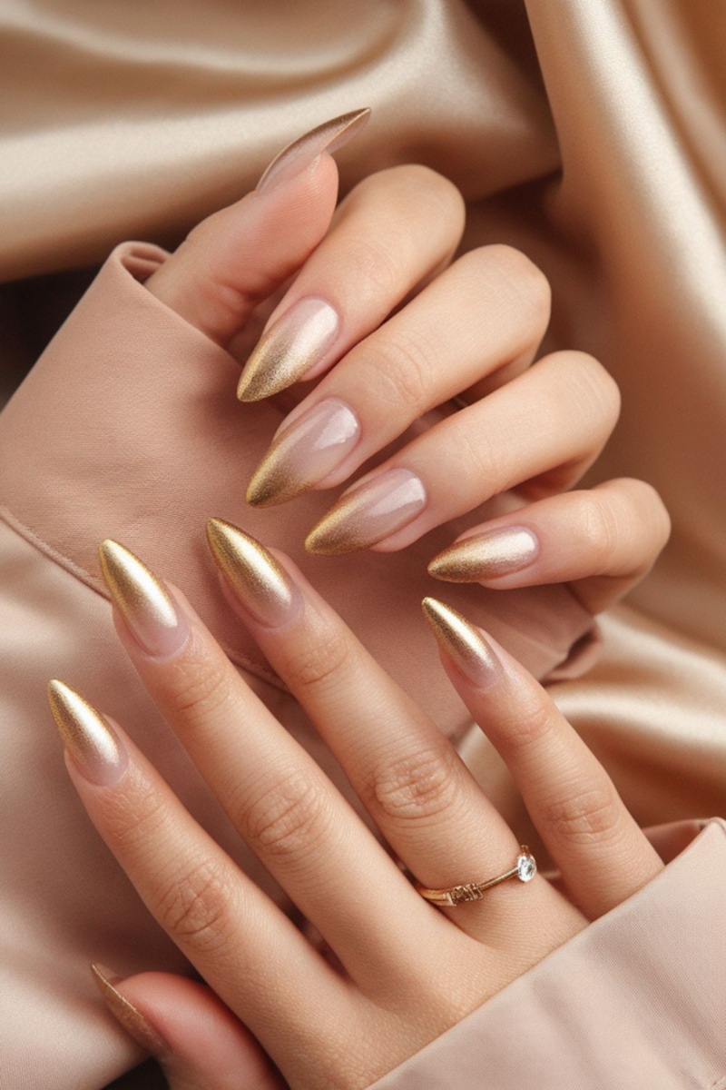 「漸層」設計是美甲界歷久不衰的經典手法之一,從指尖較為飽滿的金色,逐漸過渡至甲根的透明、裸色,形成自然的視覺遞減效果;這樣的配置能夠有效拉長手指線條,讓手部比例看起來更加修長、纖細。金色漸層同時還具備良好的生長適應性,即使指甲隨著時間長出原色,造型也依然能夠保持協調、不顯突兀。金色漸層美甲在美感與實用性之間取得了完美的平衡,並透過柔和的色彩堆疊,讓金色展現出如同夕陽餘暉一般內斂、高級的光澤。