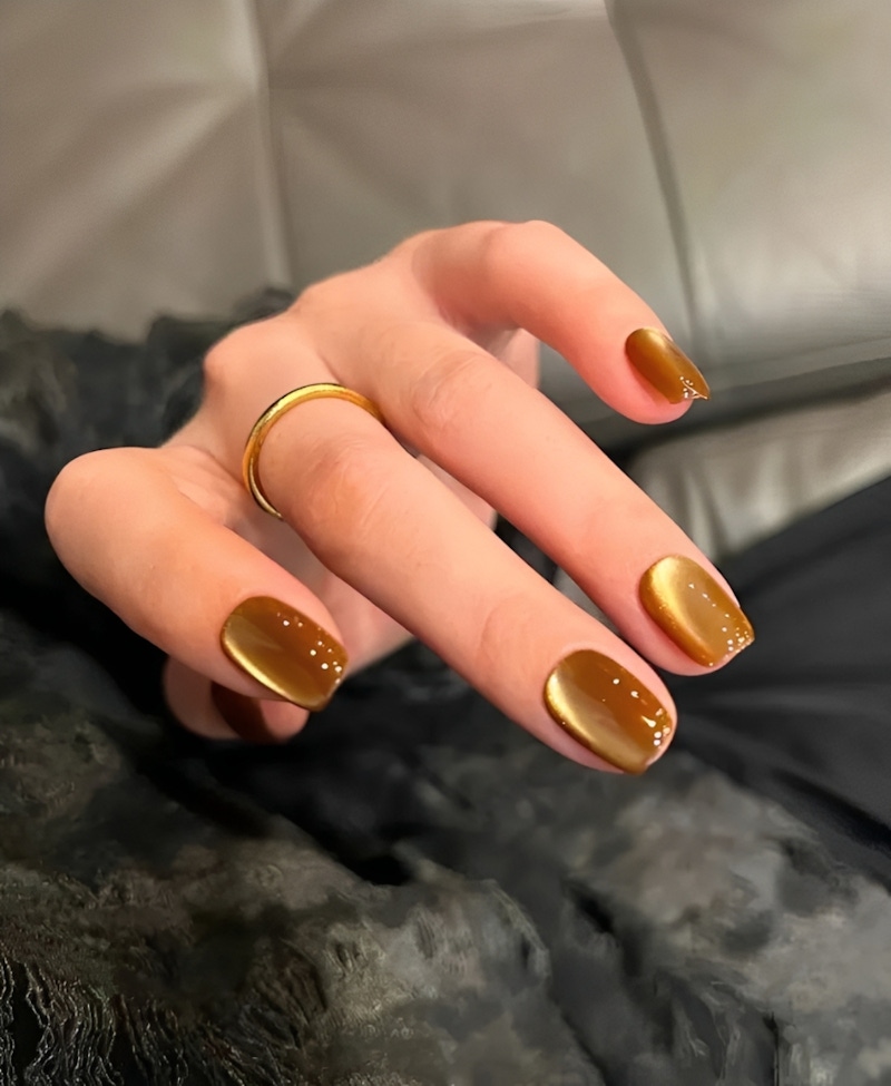 金色貓眼美甲透過獨特的光澤變化,在指尖上呈現出如同寶石一般流動的層次感。隨著手部動作的改變,金色光影會自然的轉換位置,讓美甲顯得深邃又帶點神祕氣息。相較於純色美甲,貓眼效果能夠賦予金色更多的動態感,使色彩看起來不會那麼的沉重,反而顯得更加靈動、有生氣。這種在低調中藏有張力的風格,讓金色不只象徵富貴,還多了一點氣場與藝術感,非常適合新春期間。