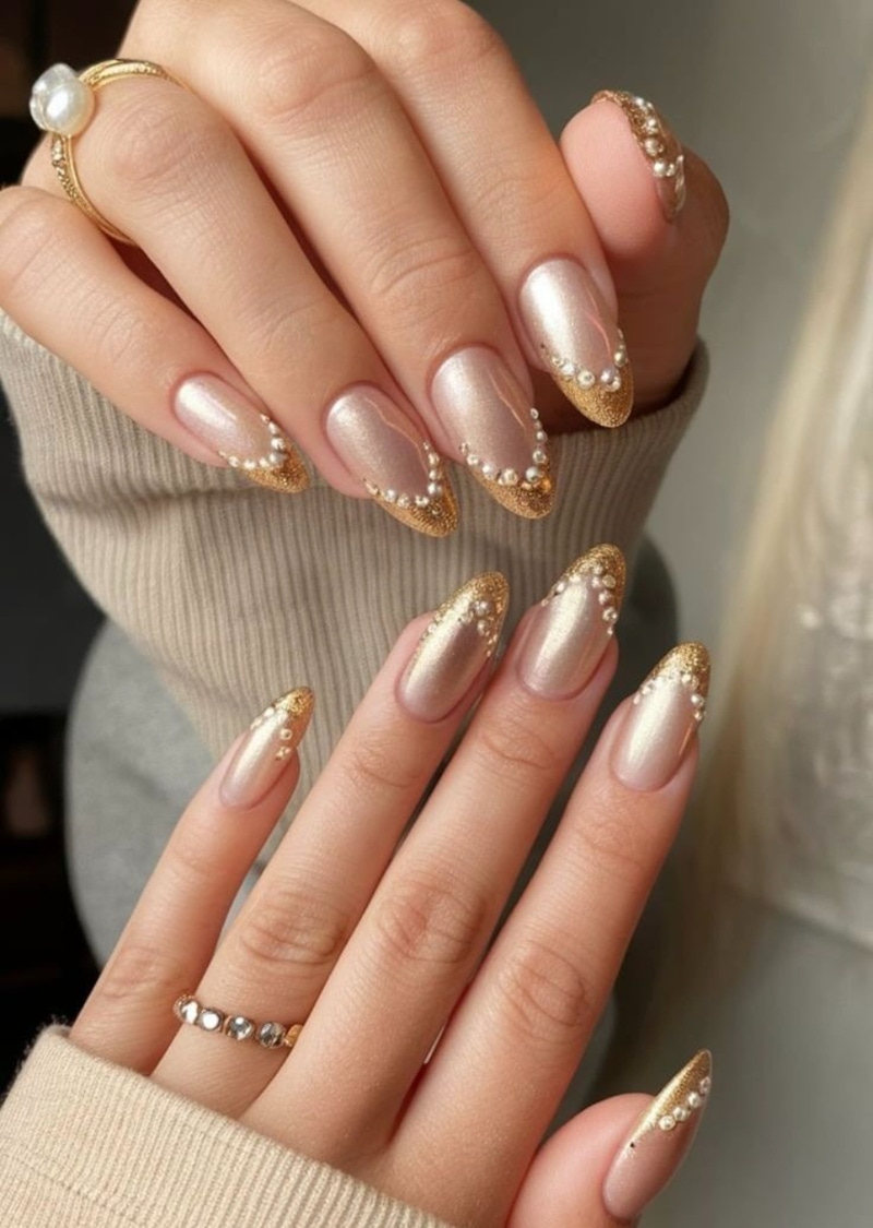 這款金色貼鑽美甲展現了高度成熟的美學思維。以溫潤的香檳金貓眼光澤作為基底,營造出通透、富有流動感的底色,為甲面建立層次與深度;而指尖前端則運用金屬細閃亮粉堆疊出近似法式美甲的結構,並在銜接處點綴細小的珍珠、碎鑽,形成規律又精緻的「鏈條」效果。這樣的排列不僅可以強化美甲的立體感,還能在優雅之中注入一絲復古的名媛氣息,是一款兼具開運氣場與高級質感的設計,讓指尖在舉手投足之間,自然的流露出知性、貴氣的光芒,非常適合過年時期。