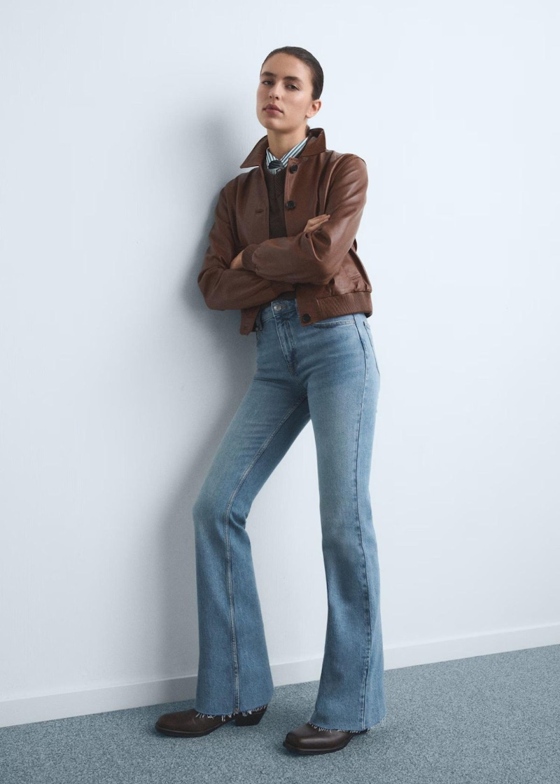 腳踩「有跟鞋」是最簡單、最直接的增高方式,而喇叭褲則擔任負責隱藏鞋跟的關鍵角色。建議選擇約 3~5 公分的粗跟鞋、尖頭靴,再配上剛好能夠覆蓋大部分鞋面的喇叭褲,避免鞋子過度外露而產生視覺切割感。當鞋跟被自然的隱藏在褲管之下,下半身就會呈現一種「從腰部一路延伸到地面」的完整感,不只能夠有效優化身形,還能讓造型變得更率性、更俐落。