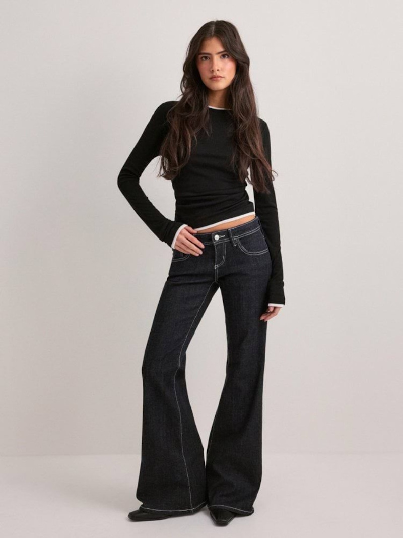 想要把喇叭褲的優勢發揮到最大,上半身的服裝絕對是關鍵!建議搭配合身、短版的上衣,減少上身的份量感,同時把視線集中在腰部位置。這種「上緊下寬」的搭配方式,能夠利用上半身的俐落線條,襯托出喇叭褲向下延伸的效果;如果上衣的衣長較長、版型較大,記得要將它紮進褲腰,讓腰線清楚露出,不只可以避免造型顯得過於寬鬆,看起來也會更有精神。