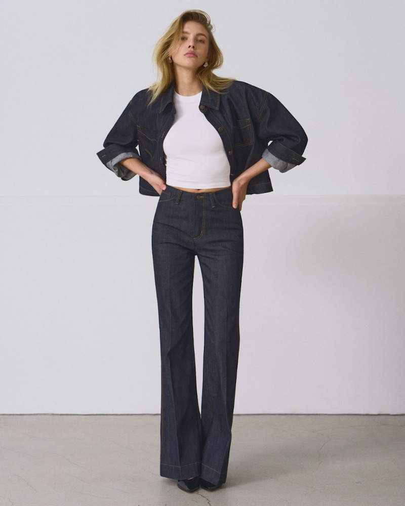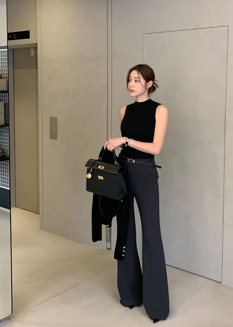 高腰設計是調整比例的關鍵!當腰線被上移到接近肋骨下方的位置,視覺重心自然就會提高,腿部線條也會因此延伸。這樣的剪裁,能夠有效縮短上半身的比例,讓身形看起來更加修長,即使不搭配高跟鞋,也能呈現出俐落的長腿效果。對於身形比較嬌小的人來說,選擇高腰喇叭褲絕對是最直接、最實際的顯高妙招。