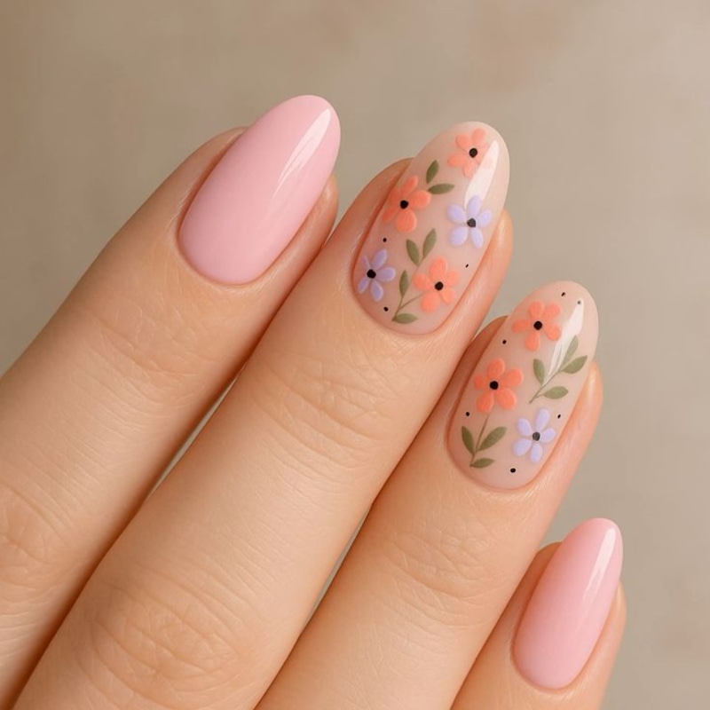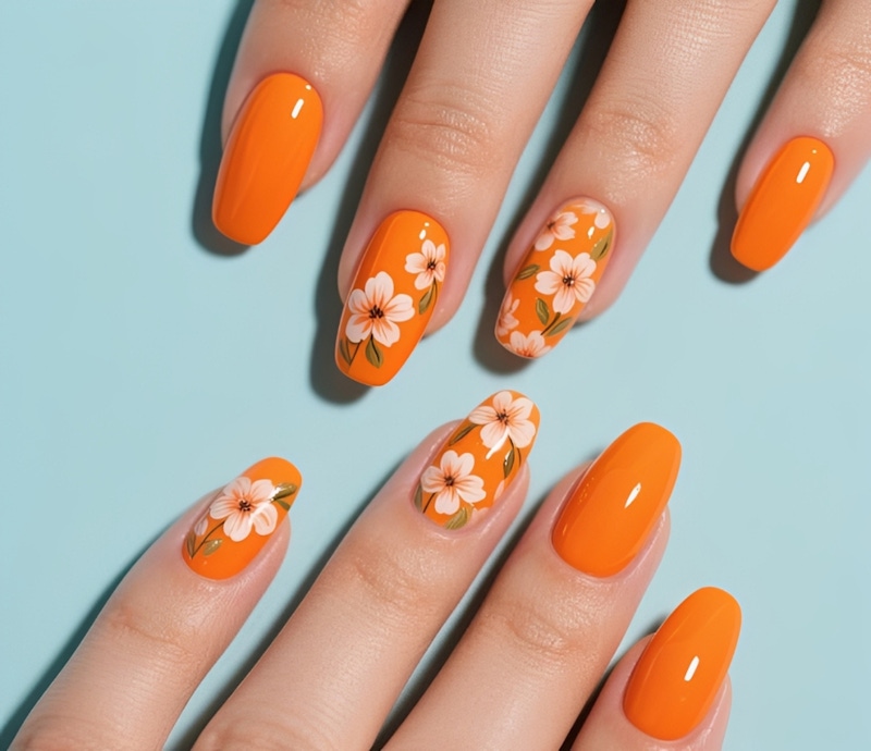 亮橘色本身就自帶活力感,能夠成為春季造型中的吸睛焦點。鮮明的亮橘底色配上細緻的手繪花卉,展現出充滿自信與個性的風格,給人一種元氣滿滿、開朗且極具感染力的印象,能夠自然的點亮雙手,讓造型更有精神。亮橘色小花美甲特別適合活潑、熱情、富有存在感的人,整體氛圍陽光又爽朗,想要放大這些性格特質的姐妹們,選它就對了!