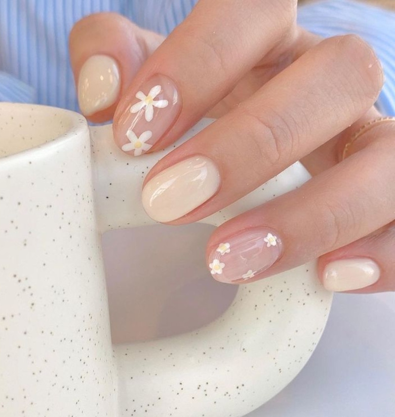▲裸色小花美甲走的是低調路線,透過乾淨的底色呈現出溫潤、耐看的質感。圖片來源:Pinterest