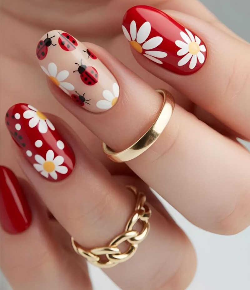 飽滿的正紅色底色與純白色的小花形成鮮明的色彩對比,營造出熱情又帶點復古氣息的美感。這樣的配色能夠瞬間提升手部肌膚的白皙度,點綴幾個小巧、精緻的瓢蟲元素,還能替甲面增添幾分活潑、俏皮的氛圍,在亮眼與細膩之間取得完美的平衡。正紅色小花美甲既有存在感,又不失精緻度,非常適合想在春季造型中增加亮點,同時保有優雅氣質的人。