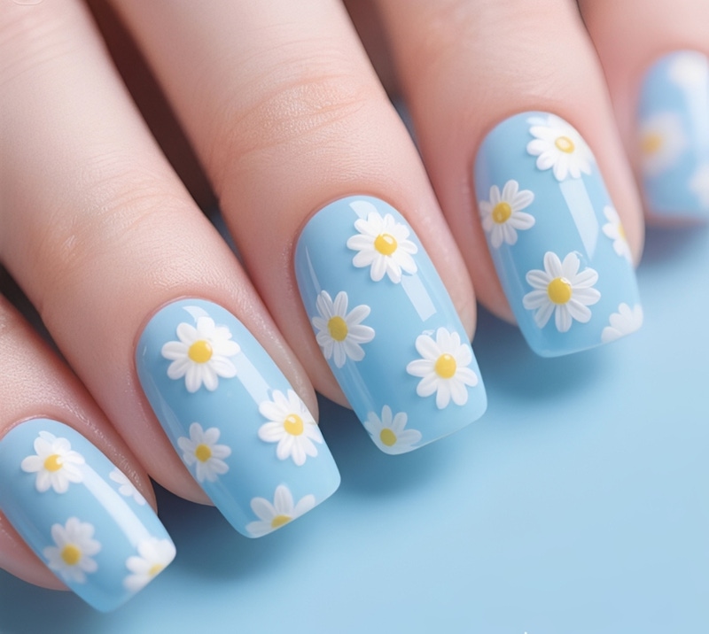 澄澈的淺藍底色搭配滿版小白花,既清新又可愛,帶有一種自然的美感。這組冷色調的配色組合,呈現出簡潔、俐落的高級質感,同時也讓手部造型顯得更加清爽;白色花瓣在淺藍基底的襯托下變得格外突出,線條簡單卻極具層次。在氣溫逐漸回暖的春季中,這樣的配色不僅清爽,還帶有知性、優雅的氛圍,喜歡藍色系美甲的姐妹們一定要試試看!