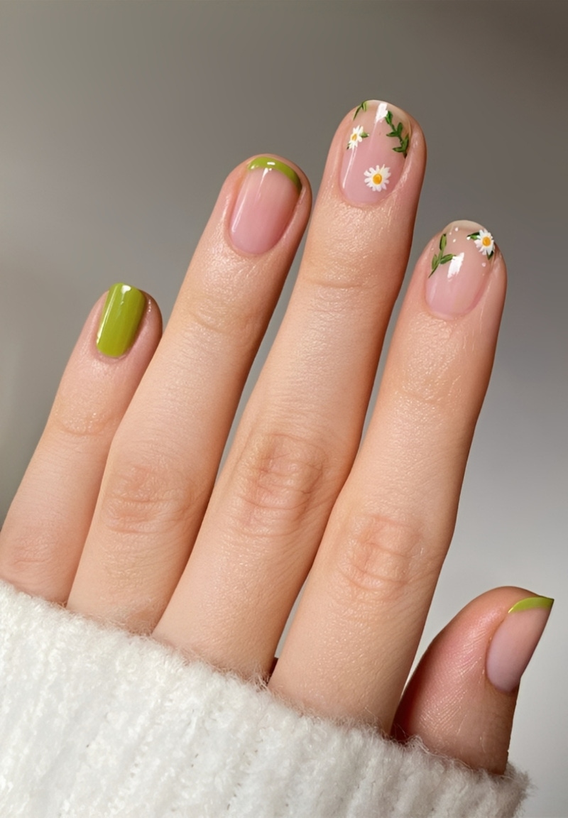 草綠色精準呼應了春季萬物復甦的生機勃勃感,是充滿生命力、帶有自然氣息的色彩。搭配相同顏色的法式微笑線,以及透明甲面上的小白花點綴,呈現出輕透、清新又有層次的視覺效果,就像是把春日綠意放上指尖一樣。綠色的活力與白色的純淨相互平衡,簡約卻不單調,自然的散發著春天的氣息,給人一種清爽、放鬆的感覺,完全是春季必備指彩!