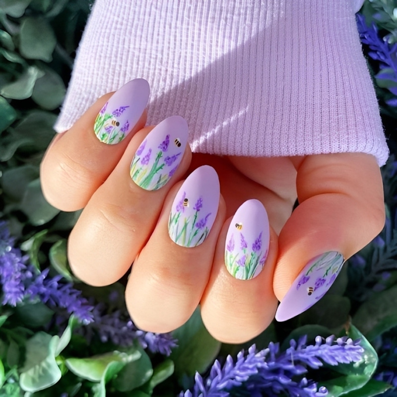 薰衣草紫底色自帶柔霧般的神祕感,搭配細緻的手繪花朵與俏皮的小蜜蜂點綴,讓甲面多了幾分法式田園的浪漫氣息,柔美中帶點靈動感,既優雅又不單調。紫色調可以有效修飾亞洲人較為暗沉、偏黃的膚色,讓指尖看起來更加白皙,還能進一步凸顯高雅氣質;這樣的設計兼具細節與氛圍感,不只溫柔、耐看還富有故事性,非常適合喜歡手繪風格的女孩們。