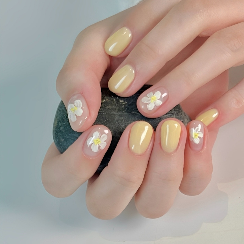鵝黃色與白色的搭配既明亮又柔和,給人一種溫暖、親切的印象。清新的配色搭配帶有浮雕感的小白花設計,營造出自然、清爽的田園氛圍,讓指尖顯得格外輕盈、明亮;這樣的組合能夠在視覺上點亮指尖,減少手部的暗沉感,看起來相當的有精神。鵝黃色不會過於耀眼、張揚,卻充滿了活力,是耐看又能展現春意與溫柔氣質的春季美甲選擇。