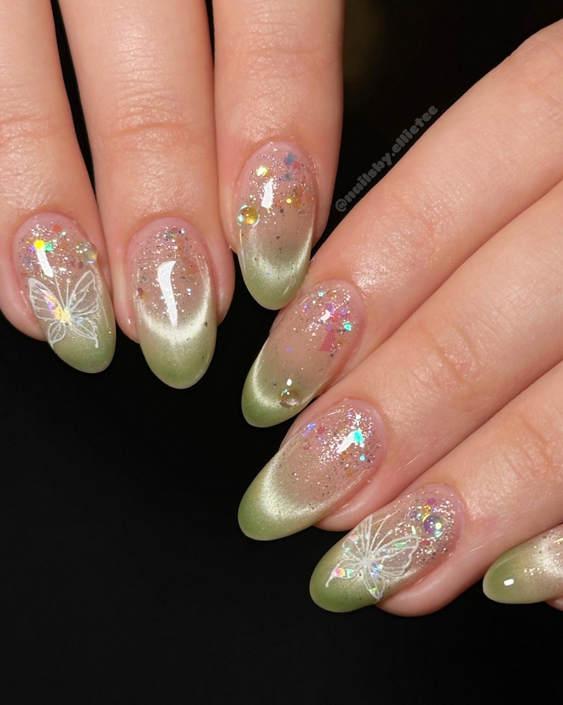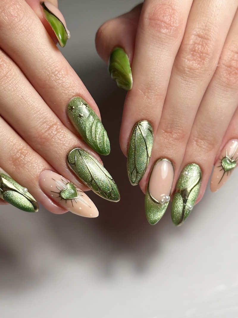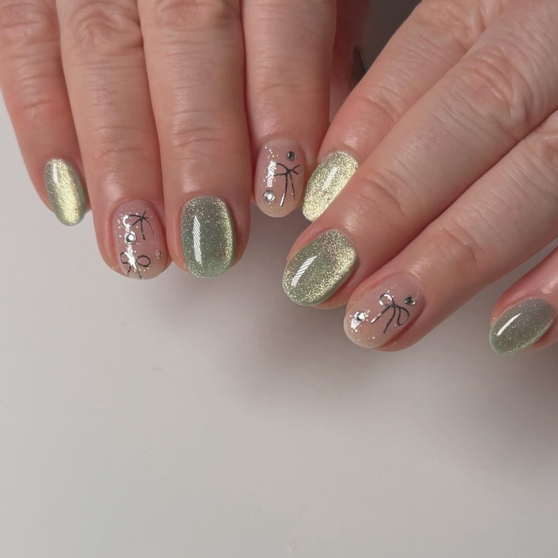 嫩綠色與貓眼設計的結合,能將春天的生機轉化成流動的光影效果。透過磁鐵控制凝膠中的磁粉,在柔和的嫩綠底色上拉出一道道流動的銀綠光帶,彷彿葉隙流光一般。隨著手指移動,貓眼光澤會產生細微的變化,讓手部造型更具層次感。這樣的手法利用色彩深度與動態光澤,讓嫩綠色美甲呈現出清新、高質感的細膩光影效果,為指尖注入一抹靈動、不張揚的春日氣息。