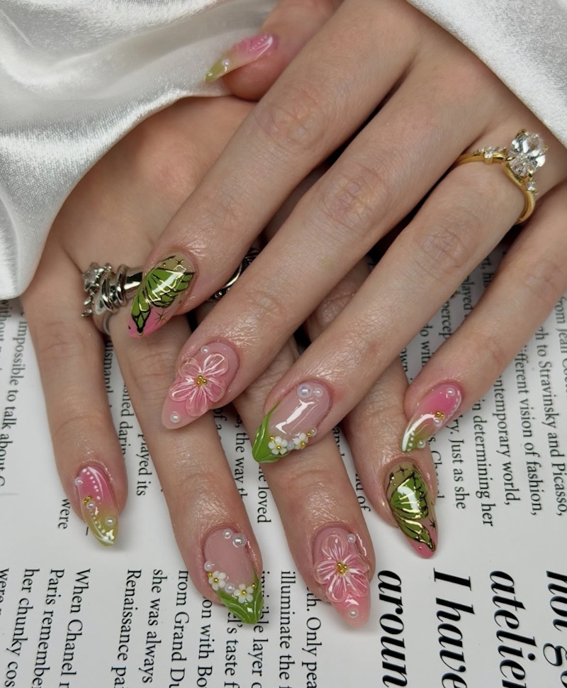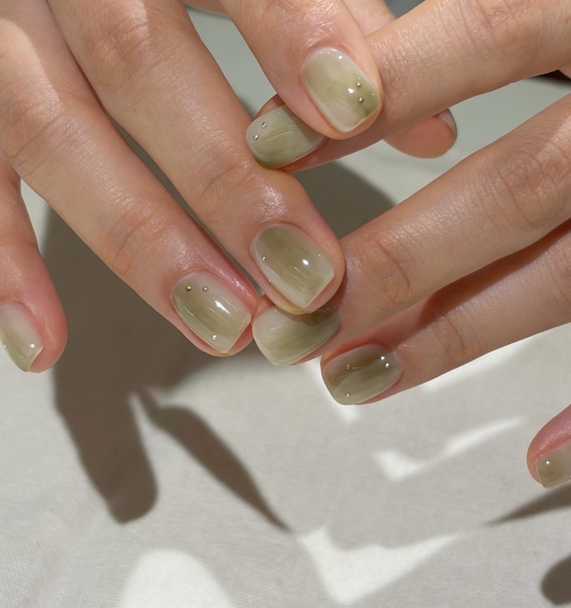 暈染效果是展現嫩綠色層次感的理想方式。將嫩綠色與白色調自然揉合,能在甲面上形成像是水墨擴散一般的柔和漸層效果。這樣的設計靈感來自於春天嫩葉初綻時的色澤變化,邊界不刻意分明,呈現出輕柔、富有呼吸感的視覺層次;柔和的綠色調還能自然的修飾亞洲人偏黃的膚色,讓指尖看起來更清透、更乾淨。當每片指甲都呈現出不同的暈染紋理時,造型也會多了一點隨性、獨特的藝術感,大幅提升指尖的靈動度。