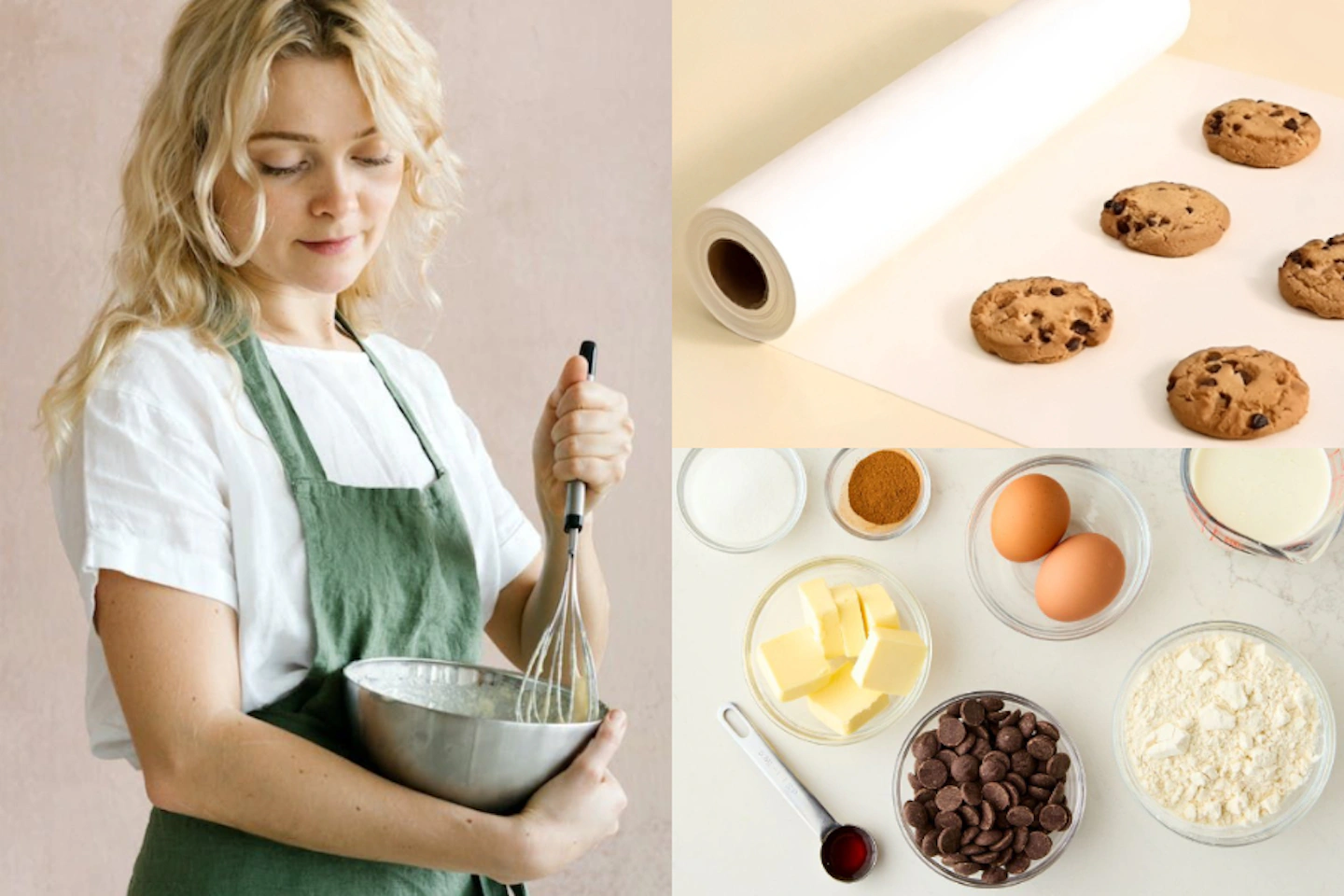 不需要一次備齊所有烘焙工具,但這些基本款一定要有!像是一組不同尺寸的「攪拌盆」,備料、混合、打發都靠它,是廚房裡使用頻率最高的存在。「量杯」和「電子秤」更是缺一不可,烘焙不像炒菜可以憑感覺,克數差一點,結果就會差很多!「手動打蛋器」或「電動攪拌機」也是必備工具,前者適合簡單混拌,後者則能省下大量的時間和體力,可以依照個人的需求來選擇。「橡皮刮刀」是處理細節的好幫手,可以將殘留的麵糊刮得乾乾淨淨,避免浪費並確保攪拌均勻;「烤盤」與「模具」是製作蛋糕、餅乾的基本配備;而「篩網」則能讓成品變得更細緻,提升口感。最後,也別忘了萬用的「烘焙紙」,鋪在烤盤裡防沾、包覆食材,甚至連擠花都用得上,是 CP 值極高的烘焙小物。只要把這些核心工具準備好,製作過程就會順暢許多,也更容易成功做出美味的甜點呦!
