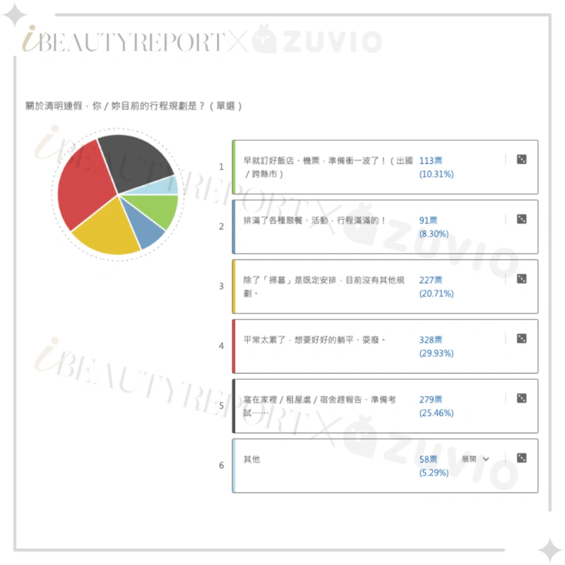 這 227 位參與者的規劃相對單純,掃墓或許是他們在清明連假中唯一的既定行程。在完成這項傳統義務後,他們可能更傾向於保持行程的彈性、留白。這種不刻意安排的狀態,或許也是一種放鬆的方式,不需要為了排行程而傷透腦筋,反而更能享受一種隨遇而安的自在感。