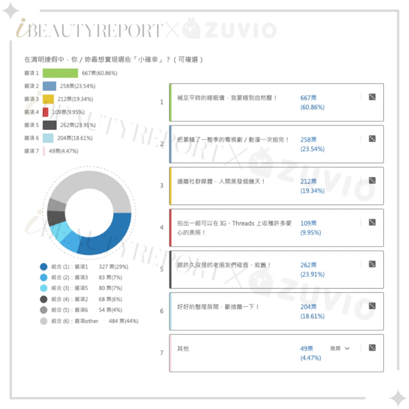 「睡眠不足」絕對是不少現代人的共同困擾,而「自然醒」也成為了 667 位參與者在清明連假中想實現的「小確幸」。他們渴望的不是一段精彩的假期,而是身體與作息的主導權。不需要像平常一樣設定鬧鐘,可以舒服的睡到自己想要起床的時候,這種基礎的生理滿足,在忙碌的現代生活中,絕對是最令人嚮往的。