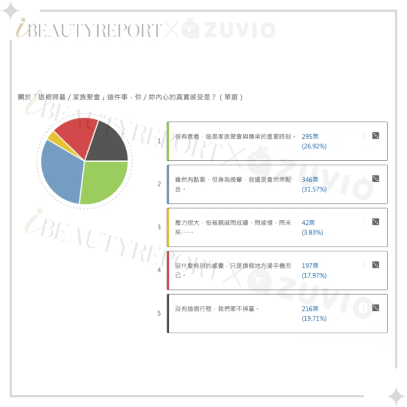 這可能是許多晚輩最真實的心情寫照:雖然覺得返鄉掃墓、家族聚會的行程稍顯沉悶,但出於對長輩的感情與尊重,還是會選擇配合。這 346 位參與者展現的,是一種溫和、穩定的責任感,願意在個人安排與家族期待之間取得平衡,透過出席、陪伴,維持家族情感的圓滿。