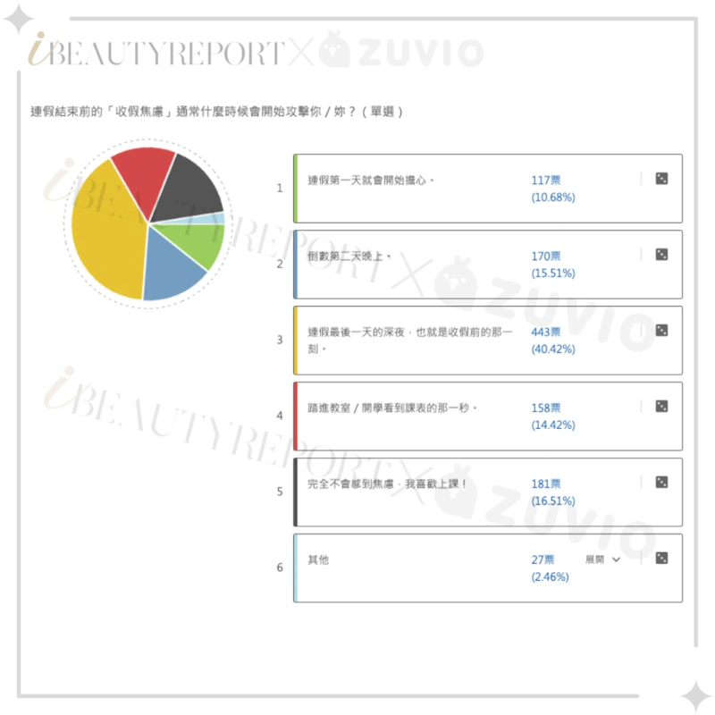 提早出現焦慮感的 170 位參與者,個性可能比較謹慎、細膩。雖然假期尚未結束,但他們可能已經開始思考接下來的課業與行程安排,提前進入準備狀態。雖然這樣的狀態有助於更順利的銜接接下來的課業節奏,但也可能讓他們在連假尾聲難以完全放鬆,提前開啟「學業模式」。