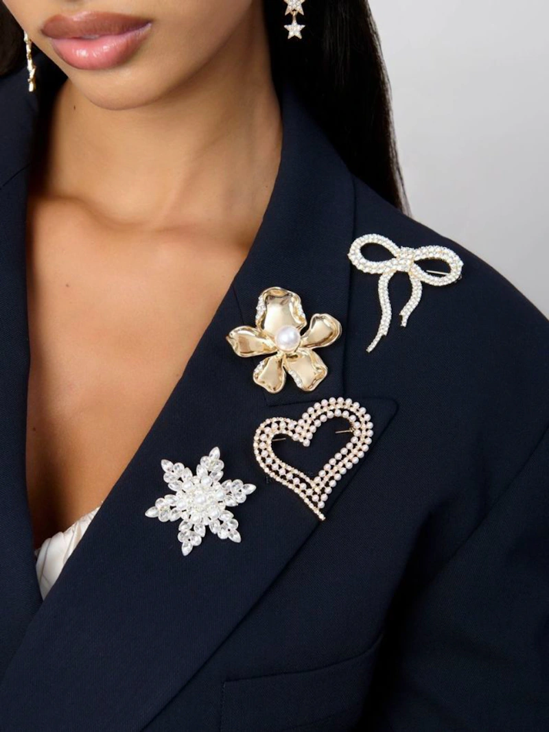 胸針在 2026 年重新回歸時尚舞台,也逐漸擺脫了過去偏正式、偏老派的印象。除了單獨使用之外,將多枚胸針疊加搭配,或是別在西裝領口、針織衫側邊,甚至把它當成絲巾釦來用,都成為新的搭配方式。這股趨勢讓造型多了更多的變化性,透過不同材質與造型的選擇,就能輕鬆調整風格調性,在各種場合之間自然的切換,是一種靈活、時尚,又極具表現力的細節單品。