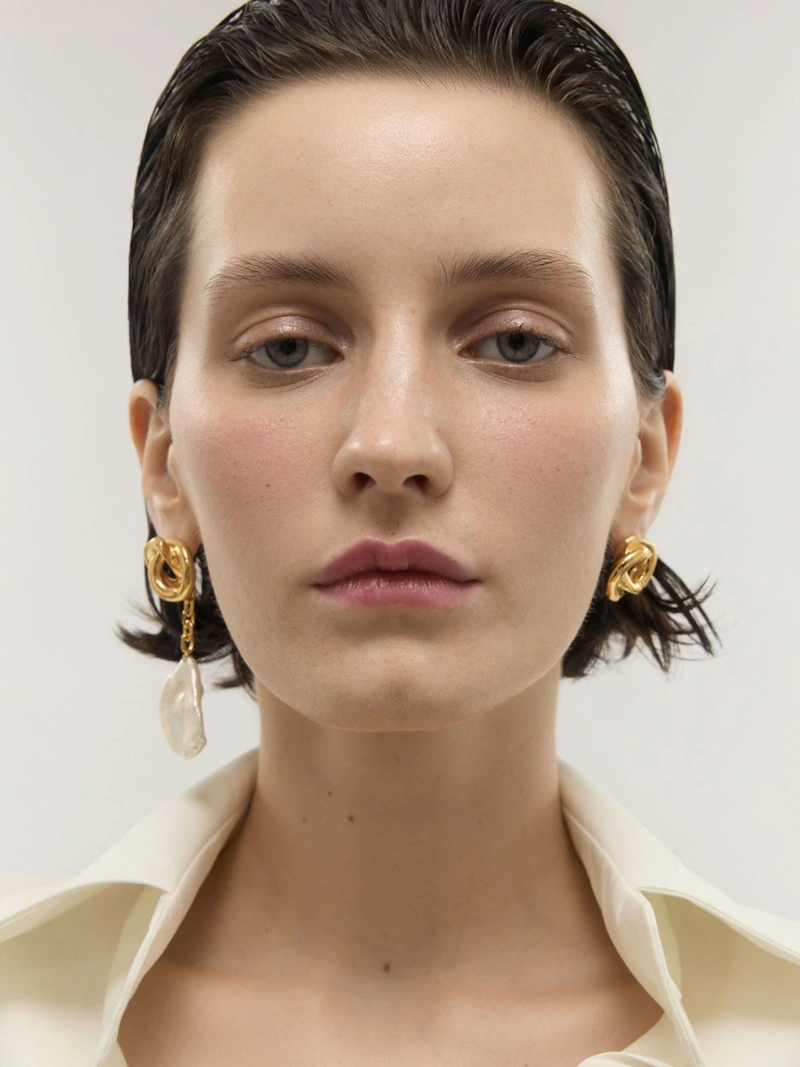 善用飾品與服裝材質之間的「對比感」,能讓造型變得更高級。穿著柔軟的針織、絲綢時,配戴硬挺、冷調的雕塑金屬耳環,能夠有效中和柔弱感;相反的,若是穿著皮革、剪裁俐落的西裝,則可以選擇珍珠或是帶有流動感的耳飾,為穿搭注入溫潤的氣息。這種材質上的衝突感,能讓造型更具層次與質感,不需要刻意營造,就能展現毫不費力的時髦態度。