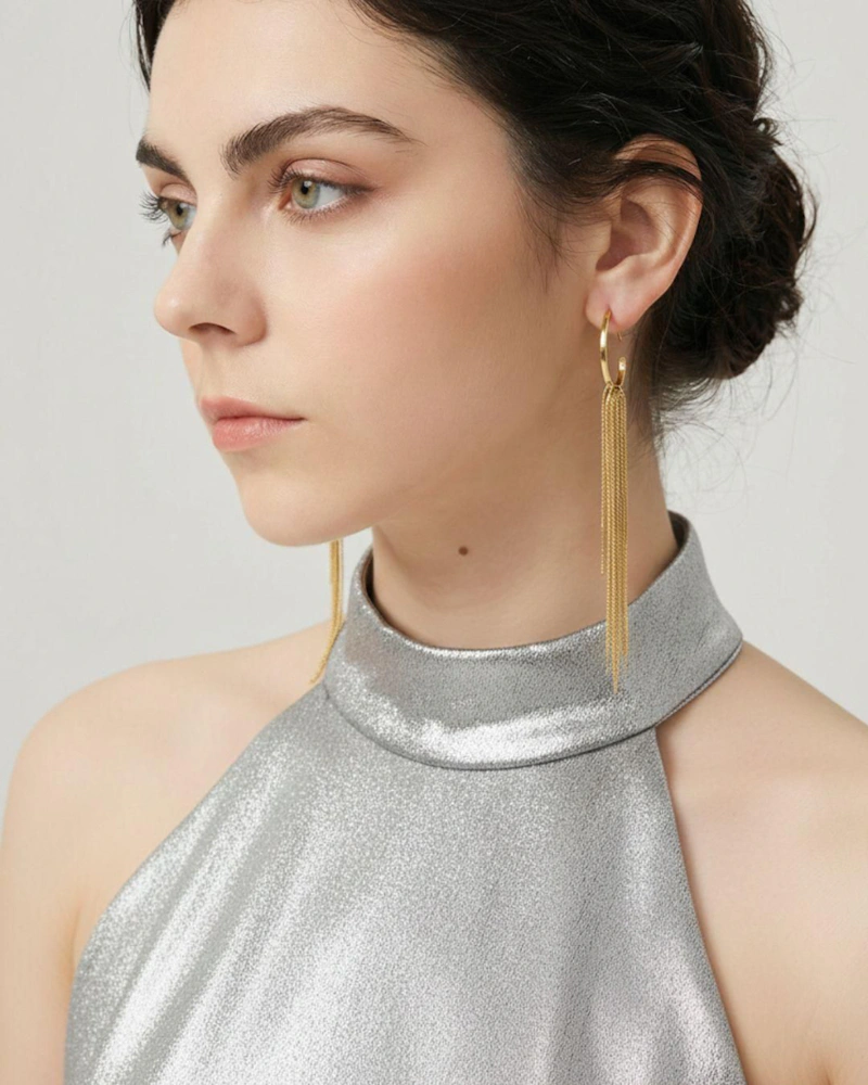 耳環的長度與款式,建議依照服裝的「領口」來調整。高領、平口上衣,適合搭配貼耳式的耳環或是中型的圓圈款式,能夠維持頸部線條的清爽感,避免在視覺上顯得過於擁擠;而深 V 領、大圓領的服裝,則可以選擇長度較長的垂墜或流蘇耳環,利用飾品的延伸感填補頸部的空白,讓耳環與領口線條形成完美的層次呼應。