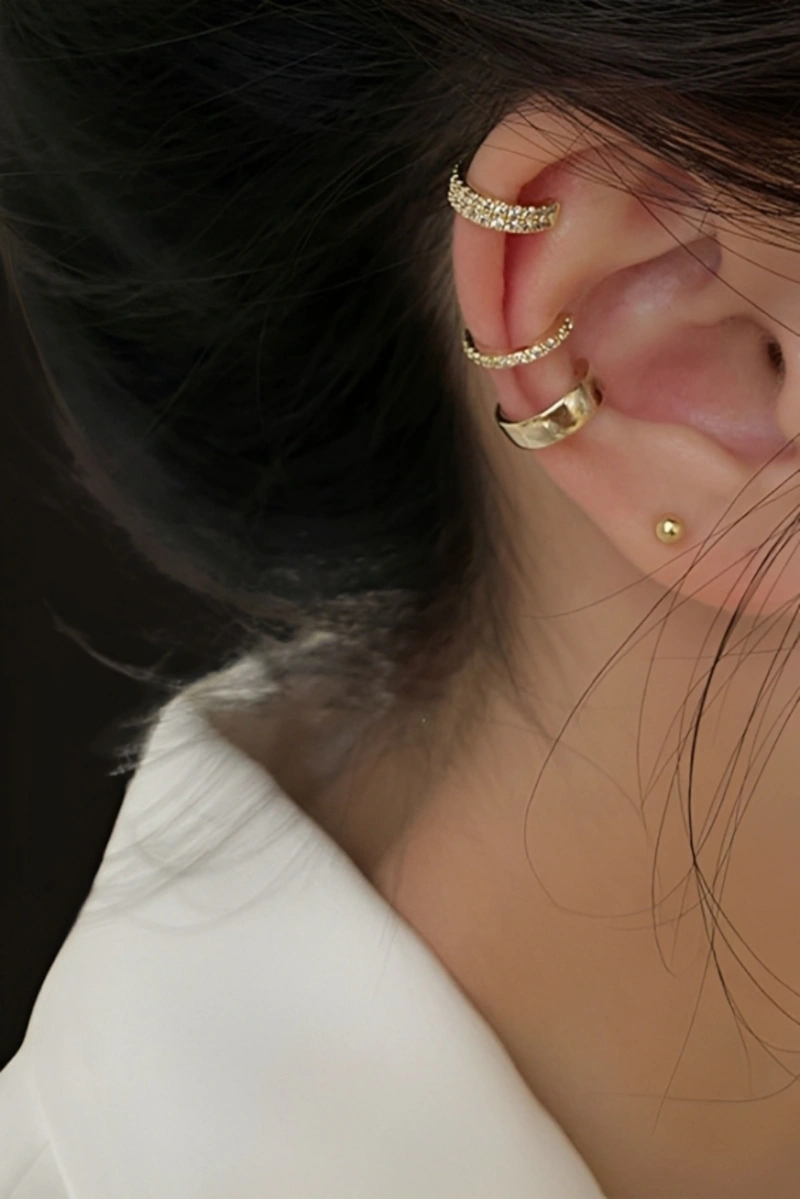 即使只有一個耳洞,也能營造豐富的層次感。可以試著在耳垂戴上基礎款的耳環,再於耳骨位置搭配 1~2 個不同粗細的金屬耳骨夾,透過由下而上的堆疊方式,增加側臉的立體度與細節感。搭配時,建議維持金屬材質的一致性,讓耳部裝飾呈現出精緻的現代風格,整體看起來會更乾淨,也會更有摩登氣息。