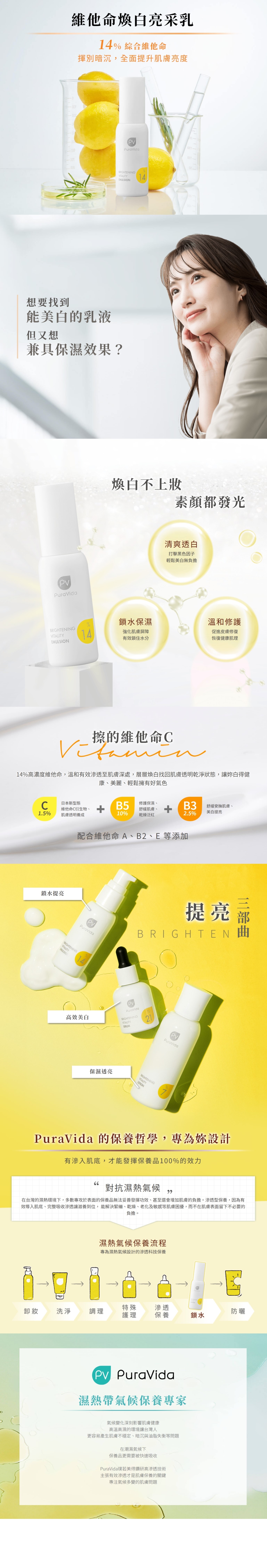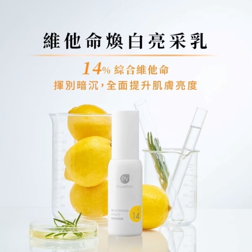 PuraVida 維他命煥白亮采乳採 14% 綜合高濃度維他命 複合配方,輕盈好吸收,能淡化暗沉、提升亮度並長效保濕油水平衡,讓肌膚自然潤白、彈潤有光。溫和配方適合日常使用,也能當作妝前基底。