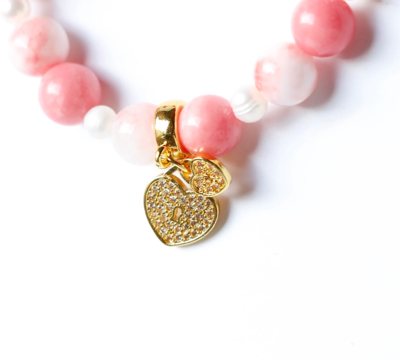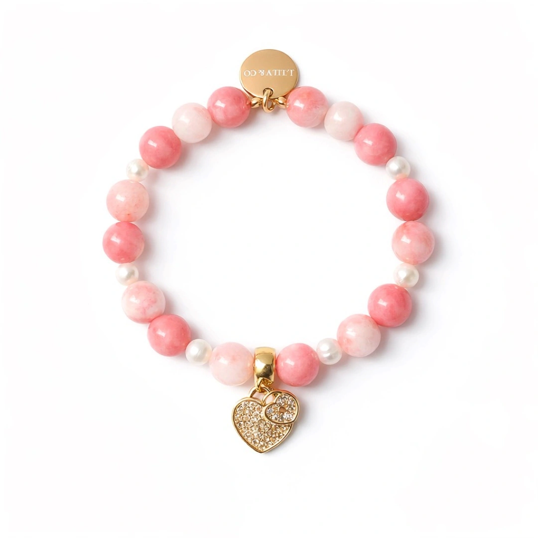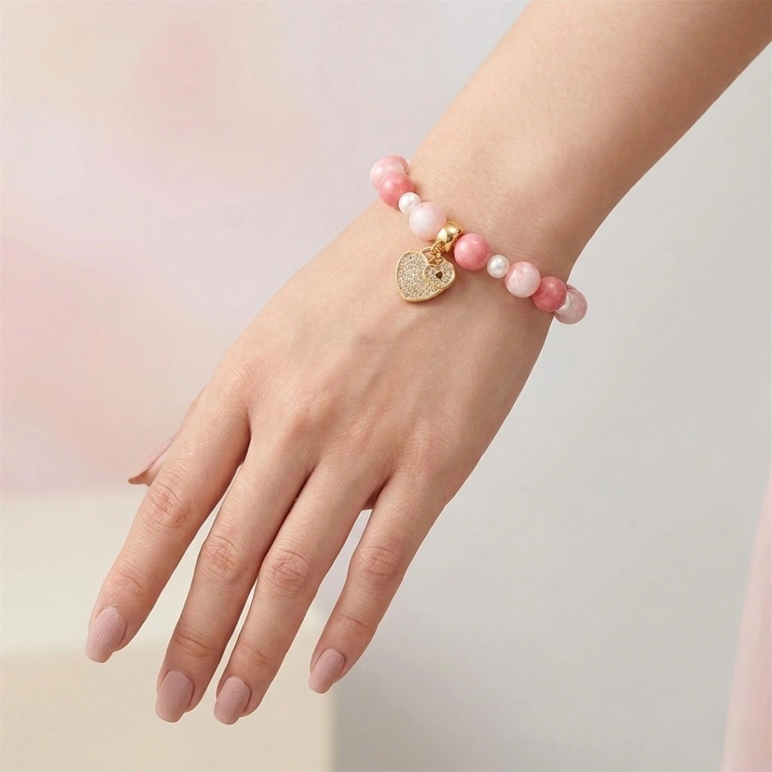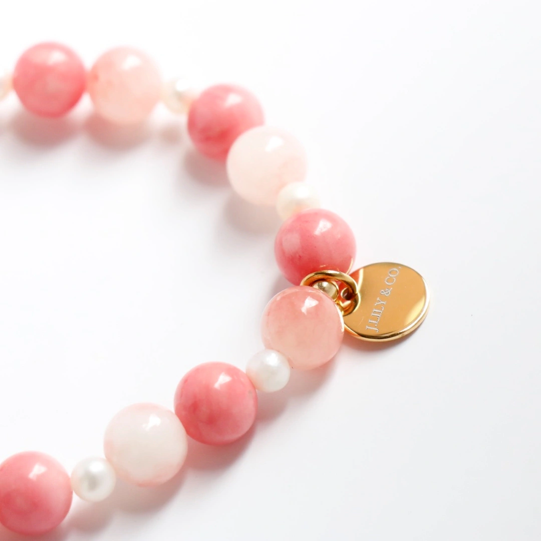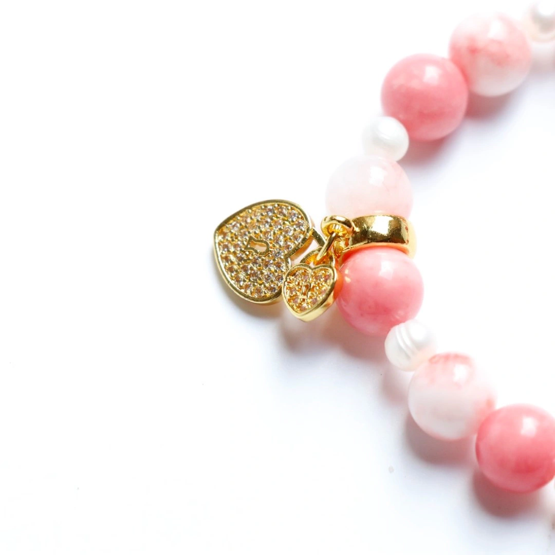 嚴選大自然珍藏的瑰寶,主體由質地細膩、色澤渾然天成的天然粉紅珊瑚圓珠串接而成,並搭配散發清透光澤的白玉(或高等級白水晶),呈現出質樸卻尊貴的有機美感。間隔點綴的天然淡水珍珠,以其溫潤的光華襯托出配戴者的優雅氣質。所有金屬配件均採用高品質的銅鍍18K金工藝,確保長久配戴依然閃耀如新;吊墜部分則結合精密微鑲技術,將高品質鋯石牢牢固定,讓每一份承諾都能持久綻放光芒。