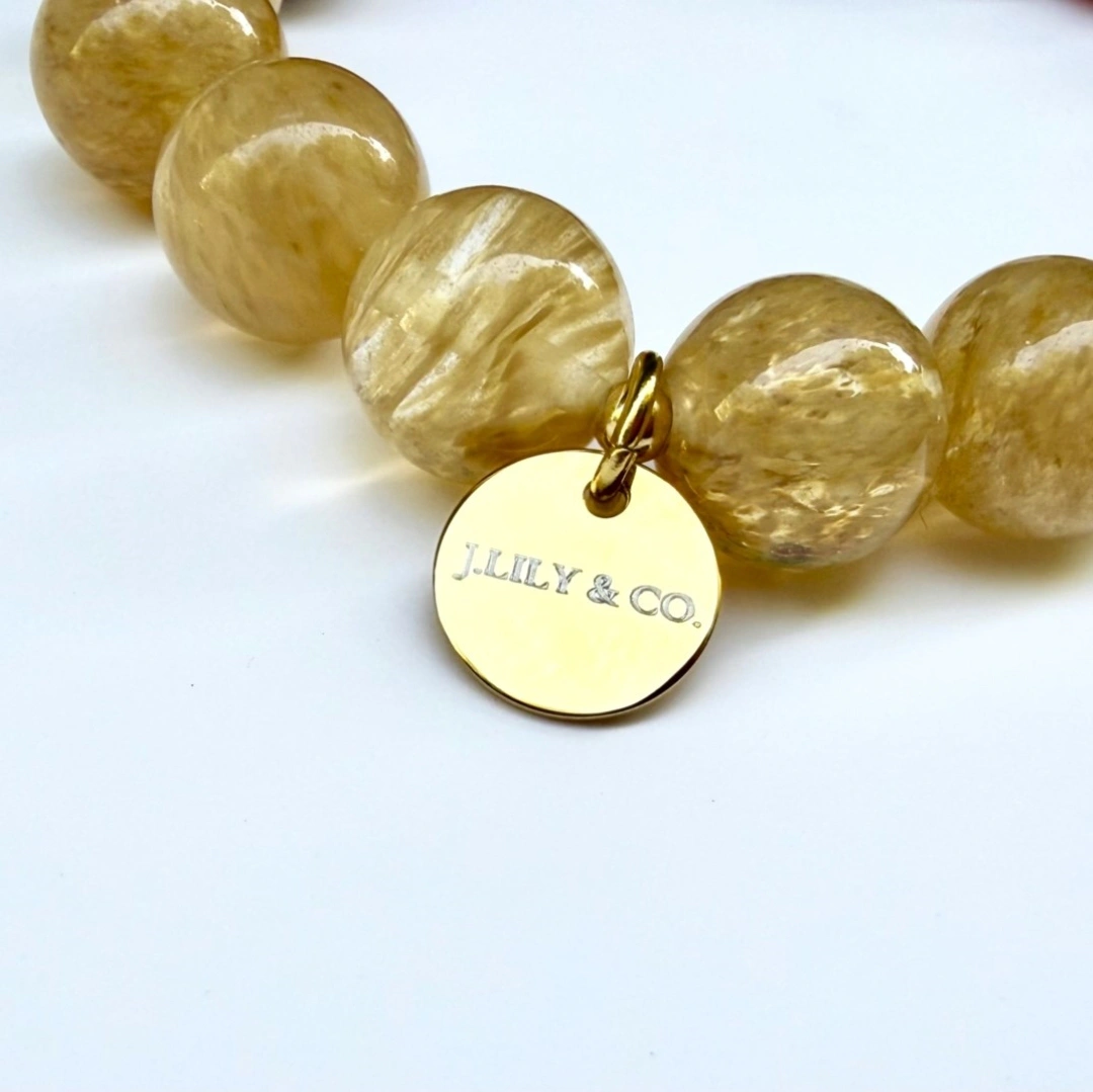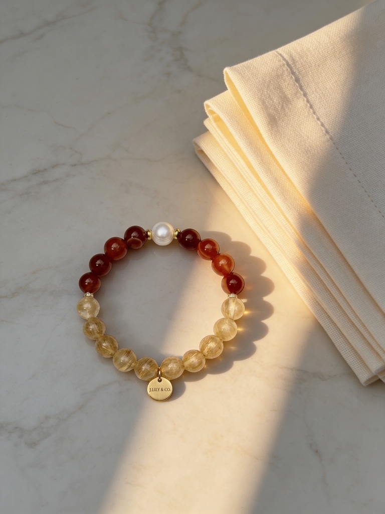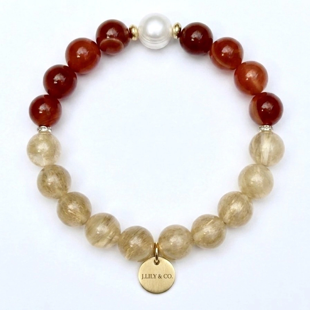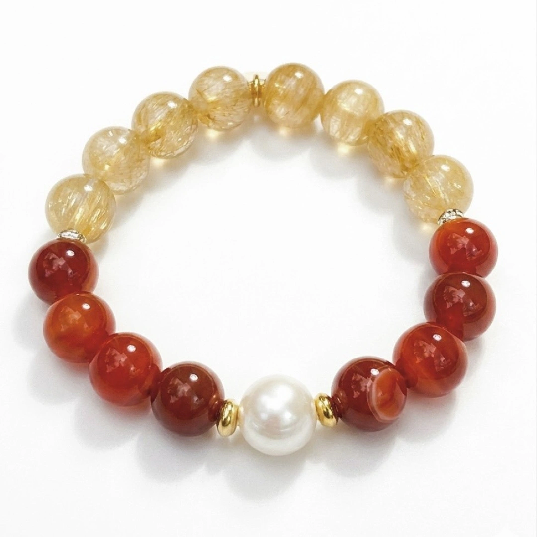 天然晶礦與高品質18K包金,打造輕奢珠寶的恆久質感 本作品嚴選顆粒圓潤、色澤濃郁的天然紅紋瑪瑙,與內部包覆豐富針狀金屬礦物的黃髮晶(金髮晶),展現寶石最純粹的原始生命力。手鍊重心點綴一顆高品質天然日本珍珠,皮光細膩且富有虹彩。所有金屬配件與品牌圓牌均採用高品質的銅鍍18K金工藝,具備優異的抗氧化性能與細緻光澤。天然礦石的潤澤與貴金屬的閃耀相得益彰,完美定義了日系輕奢珠寶的匠心與堅持。