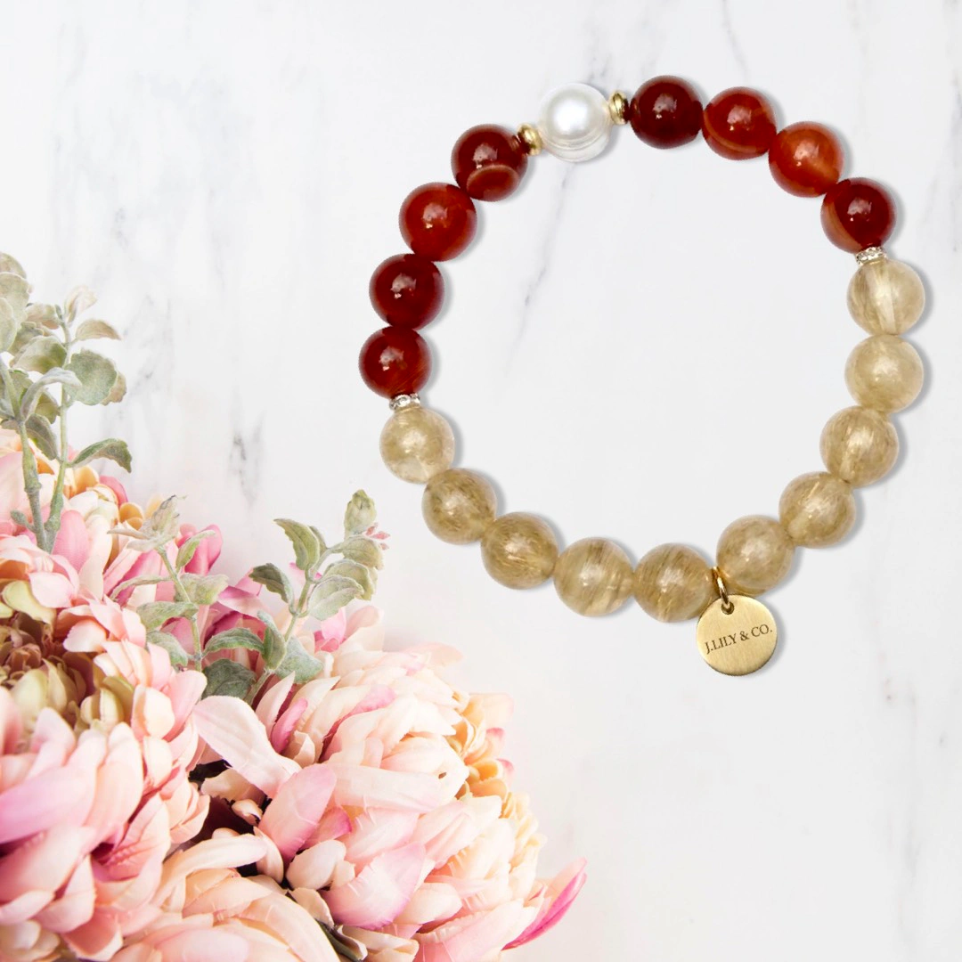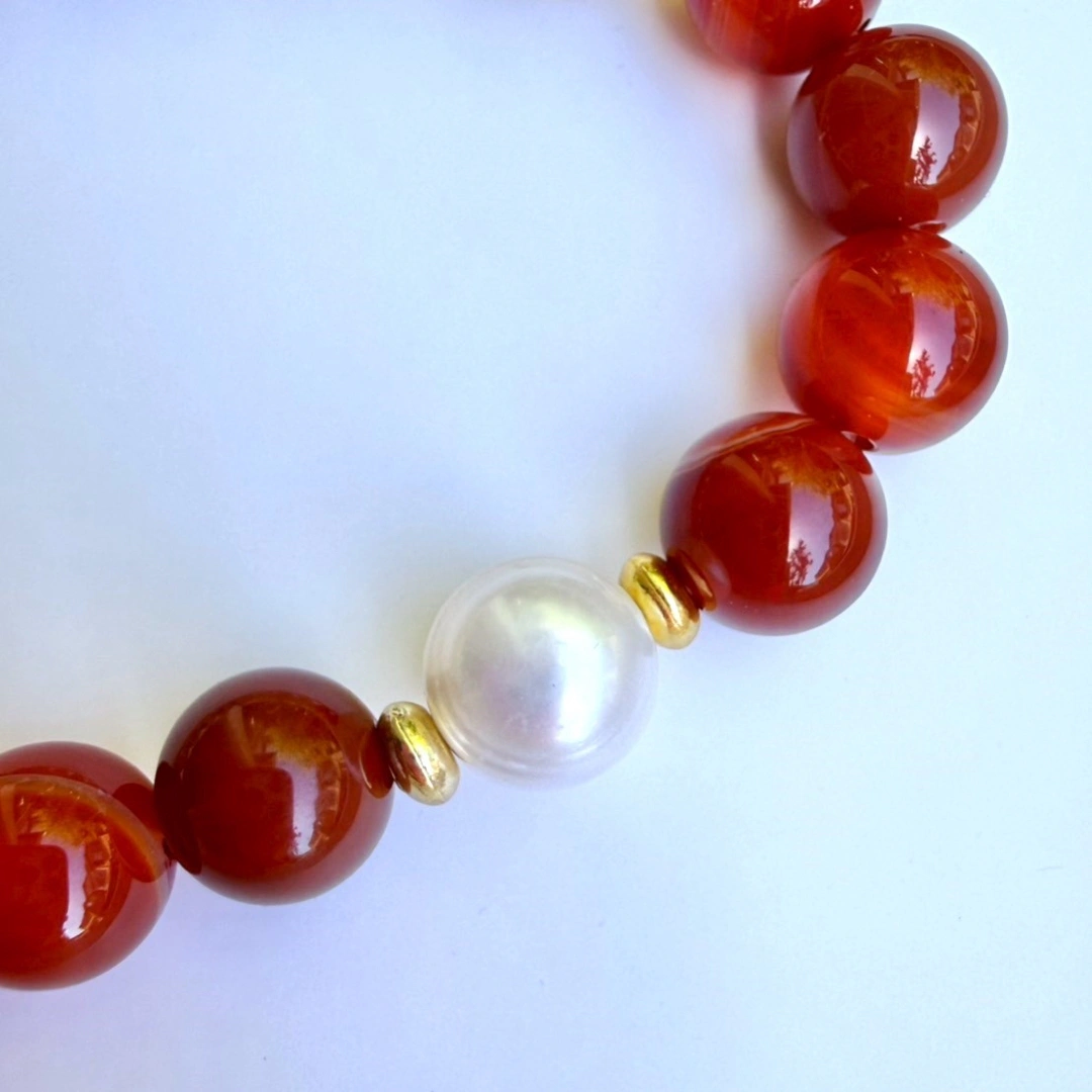 紅潤瑪瑙與金絲髮晶交錯,譜寫暖陽下律動的優雅篇章 這款手鍊在設計上採用了極具層次感的半對稱語彙,利用紅紋瑪瑙的飽滿橙紅與黃髮晶的通透金絲,營造出由暖入燦的漸層意境。最引人注目的焦點在於頂部一顆質地圓潤的日本進口珍珠,如同破曉時分的明月,與兩側閃耀的金屬飾環相互呼應。整體設計不僅修飾了手腕線條,更在轉動間流露出如曦光蔓延般的知性美感,是極具存在感的商務或日常穿搭點綴。