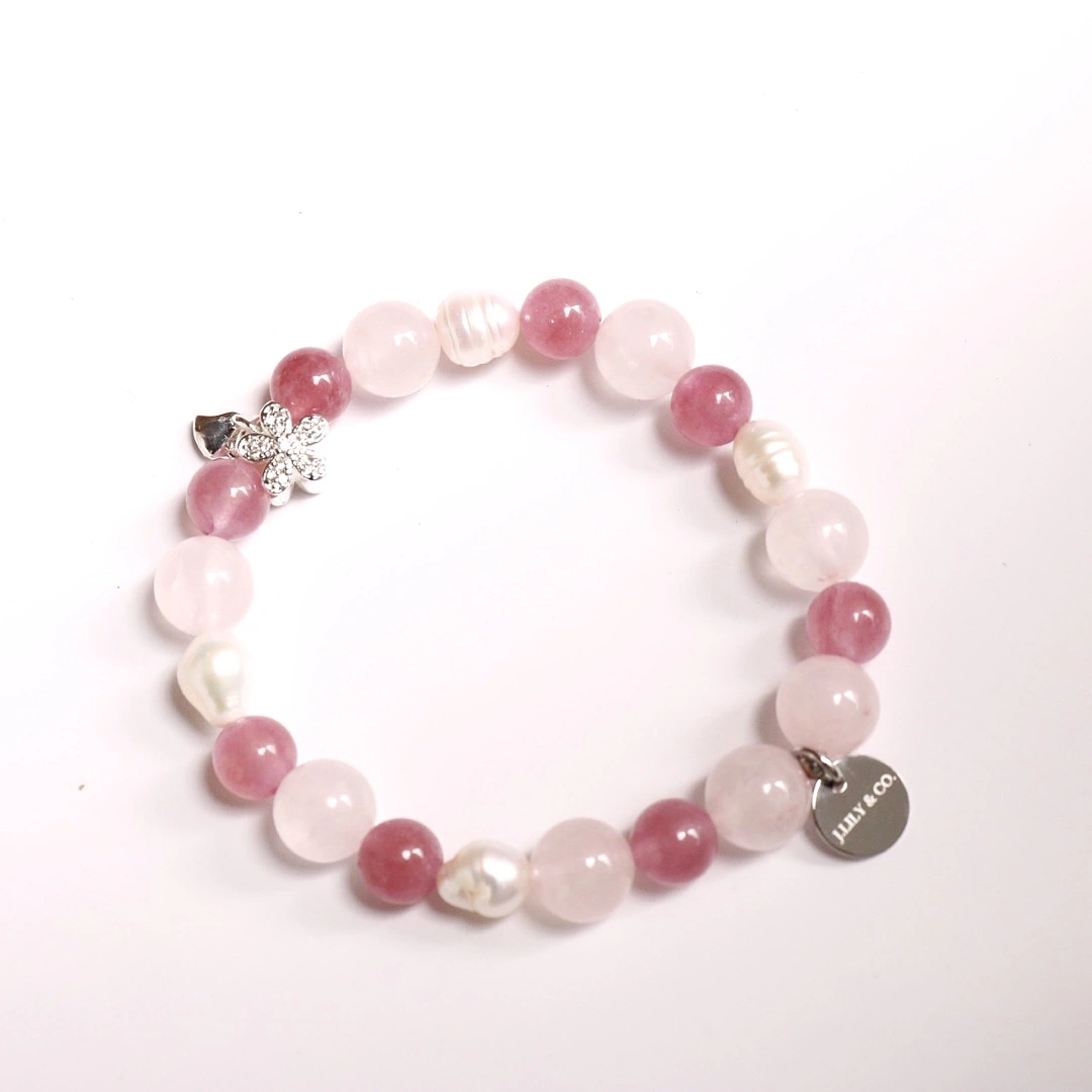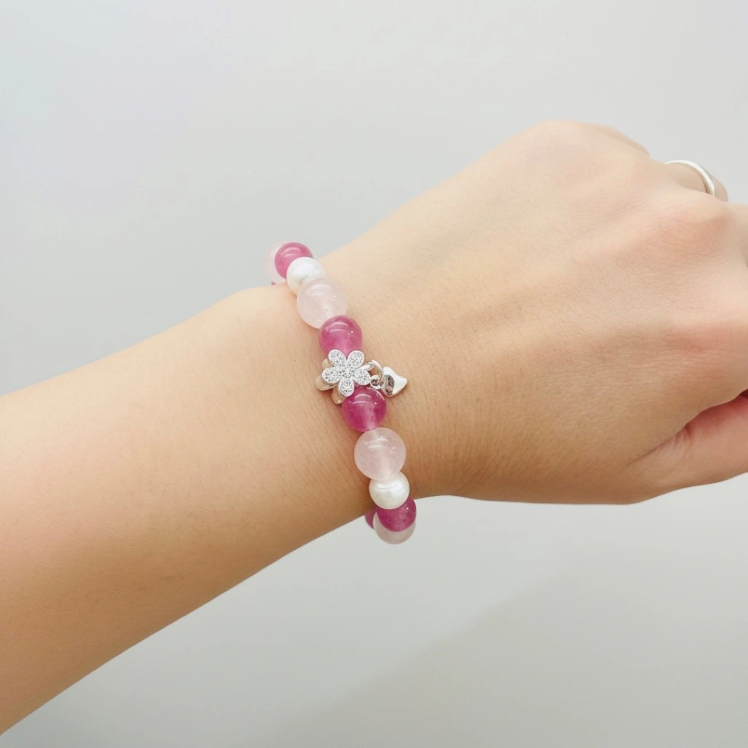 這款手鍊在設計上融合了浪漫與知性的氣息,精選不同飽和度的粉嫩晶石,由深至淺交織出如同花瓣層疊的色彩漸層。設計師巧妙地加入天然巴洛克珍珠,其不規則的自然光澤為整體增添了一份隨性而高級的質感。最令人心動的視覺焦點,莫過於那朵細緻閃耀的純銀小花吊墜,它如同在腕間盛開的幸運,與簡約的品牌圓牌相互輝映。整體設計不僅修飾手部線條,更在舉手投足間流露出溫暖而優雅的個人魅力。