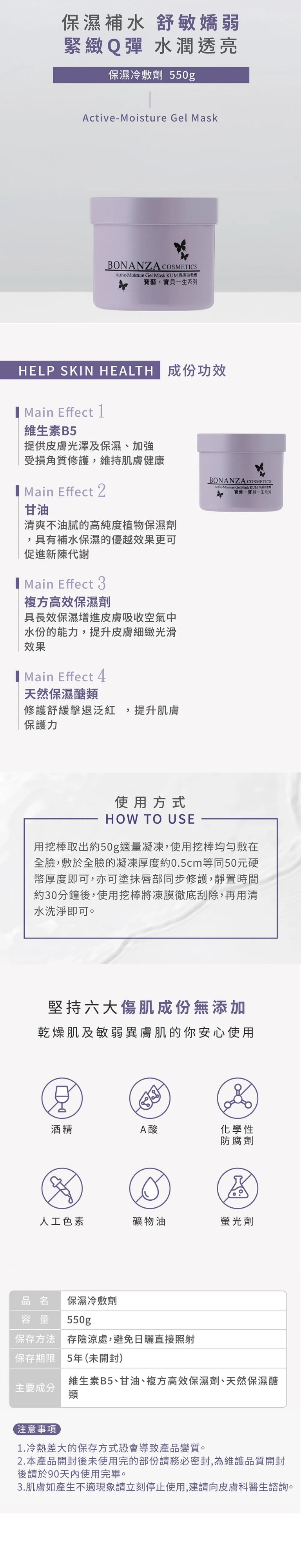 此款 保濕冷敷劑 主打 高效保濕與修護成分,搭配 加壓滲透技術 讓肌膚吸收保濕因子進入底層,有效 補水、牢牢鎖住水分、提升肌膚表層含水度。產品秉持品牌一貫的 0% 酒精、0% 化學性防腐劑、0% A酸、0% 過敏源香料、0% 色素、0% 礦物油 配方原則(與其他寶藝凍膜系列一致),適合敏感肌安心使用。