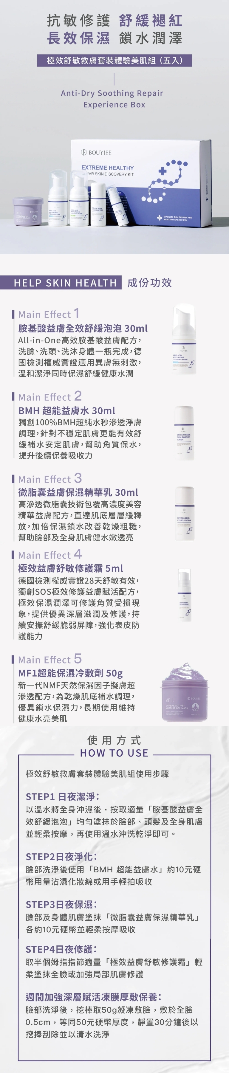 體驗組內各產品含多種修護與補水精華成分,包括: