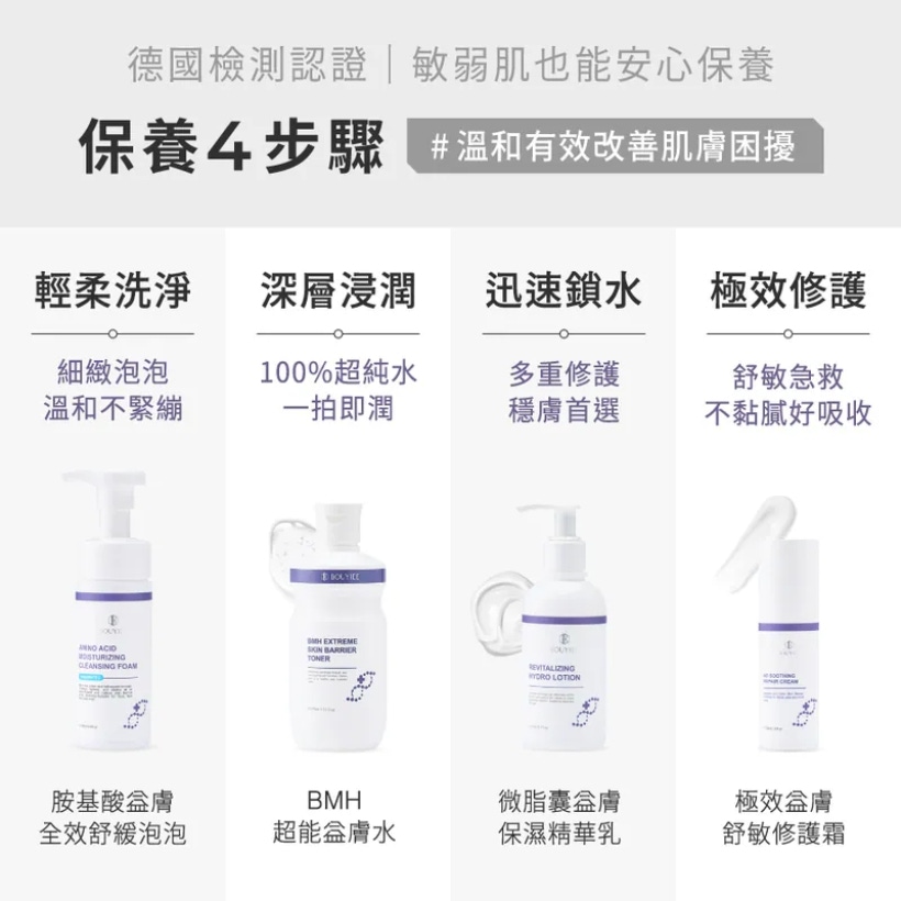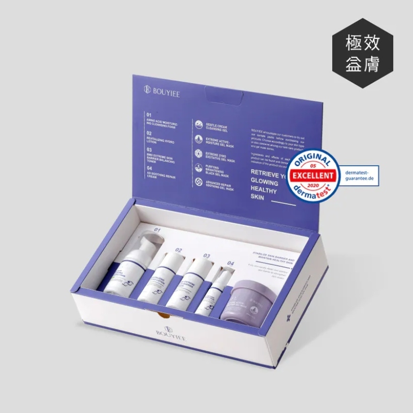 這款體驗組集合寶藝熱銷修護商品,提供 全方位舒緩、補水、修護與保濕 功效,適合敏弱、乾燥及泛紅肌膚;內含泡泡潔顏、益膚水、保濕乳、修護霜與保濕凍膜,打造完整修護流程。德國敏感肌權威認證安心使用,是冬季或乾荒膚況急救的理想選擇。