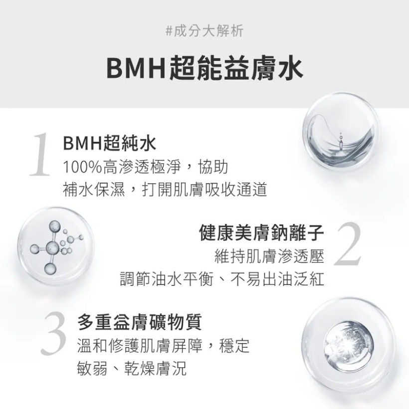 益膚水配方:BMH超純水、礦物質等快速打底補水