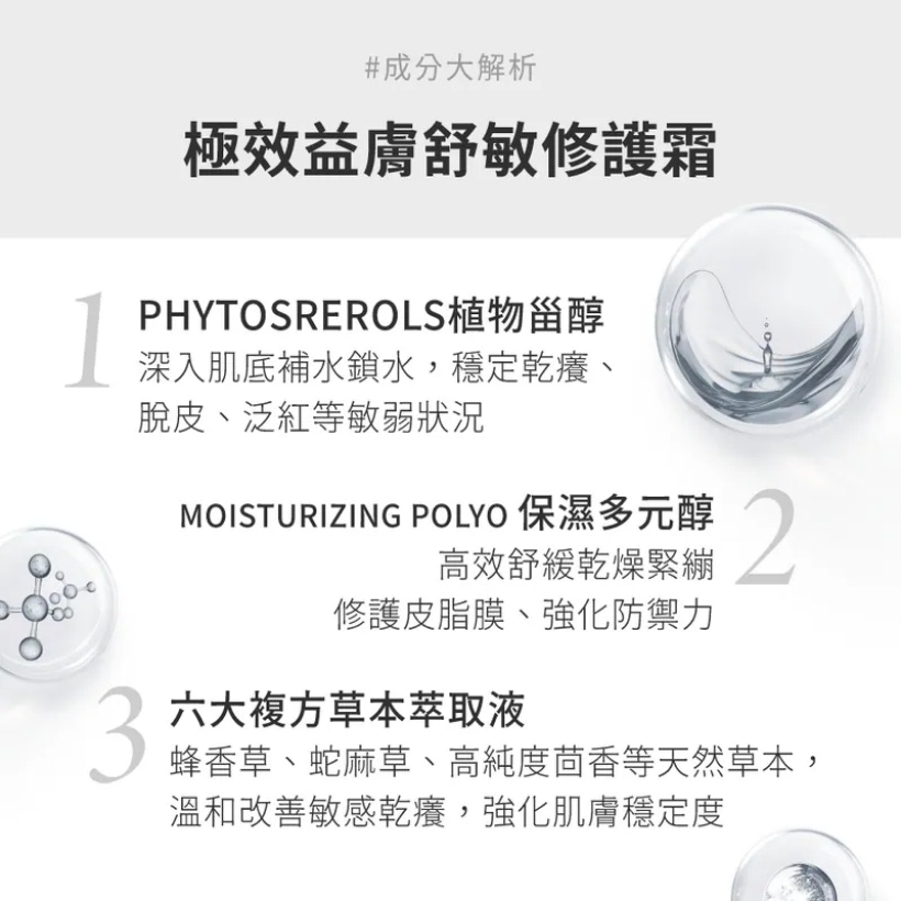極效舒敏修護霜:角鯊烷、植物甾醇等修護成分