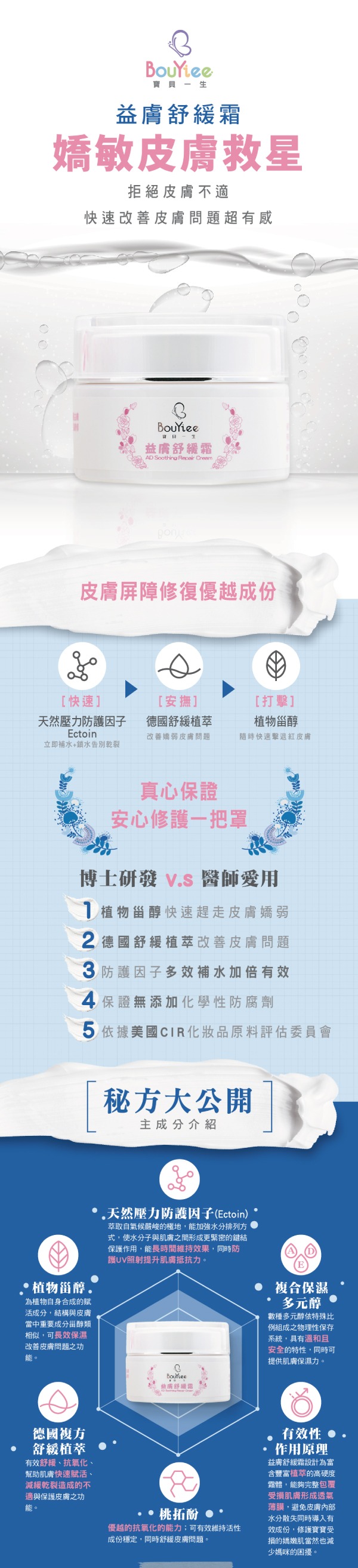 皮膚屏障受損,肌膚一定出問題!BOUYIEE益膚舒緩霜,明星成分來自植物自身合成與皮膚所需甾醇相似的「植物甾醇」、「德國複方舒緩植萃」、「複合保濕多元醇」、「桃拓酚」等能有效補充肌膚所需保濕力,鎮定舒緩泛紅、乾癢、痘痘、發炎、乾裂受損的肌膚問題,還能同步抗氧化。萃取自極地的「天然壓力防護因子Ectoin」結合「有效性作用原理」,將富含植萃的高硬度霜體,讓水份與肌膚更緊密結合並完整包覆受損肌膚,同時在表層形成透氣薄膜,長時間預防水分流失同時導入有效修護成分,內調理外修護,迅速提升肌膚抵抗防禦力。
