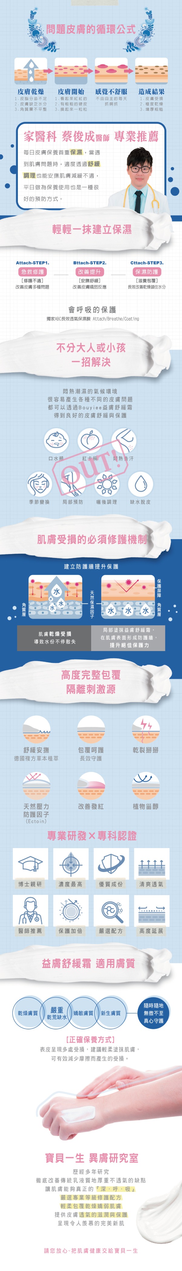 擁有多年敏弱肌測試經歷的「BOUYIEE寶藝」凍膜研究專家X博士級專家親自參與,專為異位性皮膚炎研發的舒緩系列,針對長年缺水脫皮、乾癢、泛紅、受損肌膚(曬後紅腫、乾裂、口水頰、紅屁股...),堅持開發最好、最純粹、濃度最高、0化學性防腐劑添加的保養品,連醫師們都愛用。消費者實證測試,連續4-8週後肌膚就能漸漸回復健康狀態,根本是乾敏、問題肌膚的救星!舒緩系列商品通過德國DERMATEST 皮膚科醫師臨床由敏感肌患者72小時親膚檢測,榮獲最高等級五星認證;通過全程經由皮膚科醫師監控的亞洲最大人體肌膚臨床測試《親膚無刺激、有效成分足量添加》。