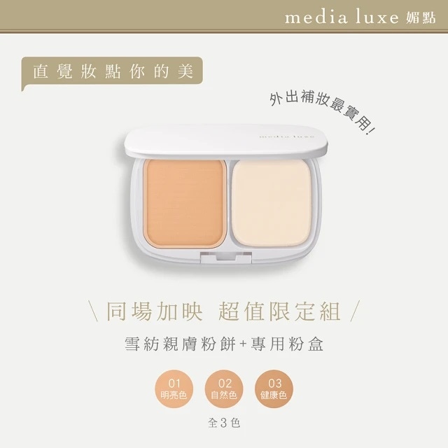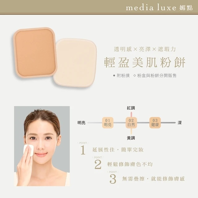media luxe媚點全新《雪紡親膚粉餅》採用特殊的「光感遮瑕薄膜科技」,運用光反射原理,提亮膚色又能高度遮瑕,保持妝容輕透感,顛覆以往粉餅妝感厚重的印象。雪紡般細膩粉質、上妝如奶油滑順、完美服貼肌膚紋理,就像打開美肌濾鏡,修飾粗大毛孔並淡化大小瑕疵,自然妝感有如母胎美肌,整體呈現出來的精緻妝容,不輸專櫃粉餅。